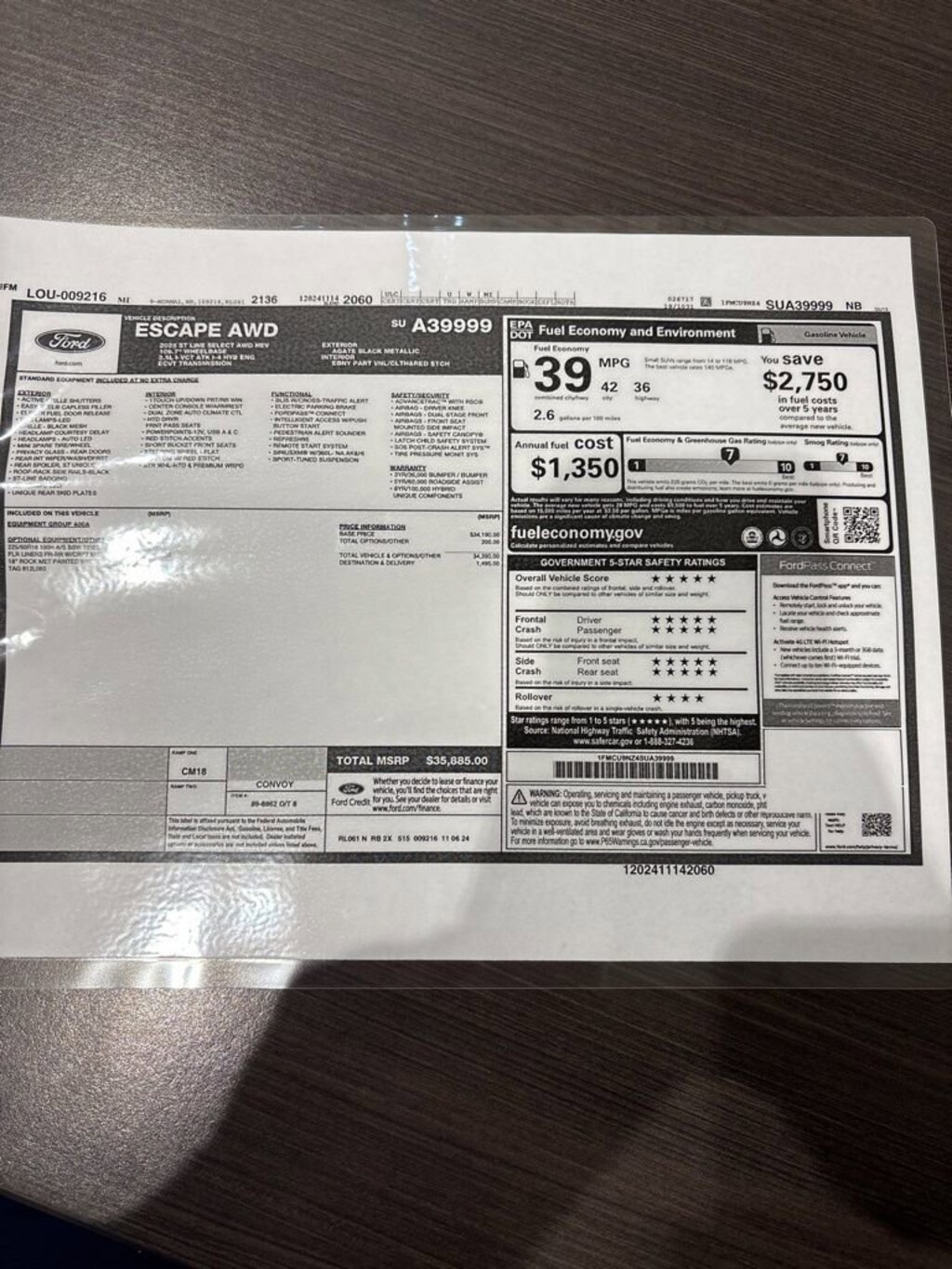 2025 Ford Escape Hybrid ST-Line Select Recent Arrival! We want you to shop confidently for your next used car at The BIG Ford Store, D-Patrick Ford. We are located on Highway 41 and Walnut in Evansville, right next to the Lloyd Expressway. Buy this used vehicle 100% online or in-store. This pre-owned vehicle was put through an extensive inspection before hitting our lot. Because of this, we are able to offer a 3-month/3,000-mile comprehensive limited warranty. You also get our Love It or Return It 5-day, 300-mile Exchange Policy. See our website for more details on both. We also offer extended service plans, vehicle protection plans, and offer a free to you CarFax vehicle history report. *Prices listed do not include a $250 documentation fee, applicable tax, title, tags, license, or $195 service and preparation. All pricing, vehicle information, and features (such as accessories and color) are believed to be accurate, but we do not warrant or guarantee such accuracy. The prices shown above may vary from region to region, and incentives are subject to change. Some offers listed may not be available to all customers. All online sale commitments are subject to confirmation of continued availability of vehicle. Once availability is confirmed, online sale agreement becomes binding upon the parties. If any information found on the website is thought to be erroneous, please verify information with a customer service representative. See dealer for full details. Looking to sell your current vehicle? We buy cars for cash. Every test drive at D-Patrick Ford in Evansville earns $10 to a local charity. Schedule your test drive today! 2.5L iVCT, 2.91 Axle Ratio, 4-Wheel Disc Brakes, 6 Speakers, ABS brakes, Air Conditioning, Alloy wheels, AM/FM radio: SiriusXM, AM/FM Stereo, Auto High-beam Headlights, Automatic temperature control, Brake assist, Bumpers: body-color, Compass, Delay-off headlights, Driver door bin, Driver vanity mirror, Dual front impact airbags, Dual front side impact airbags, Electronic Fuel Door Release, Electronic Stability Control, Emergency communication system: SYNC 4 911 Assist, Equipment Group 400A, FordPass Connect, Four wheel independent suspension, Front & Rear Floor Liners w/Carpet Mats, Front anti-roll bar, Front Bucket Seats, Front Center Armrest, Front dual zone A/C, Front fog lights, Front reading lights, Fully automatic headlights, Heated door mirrors, Heated front seats, Heated steering wheel, Heated Vinyl/Cloth Front Sport Contour Bucket Seats, Illuminated entry, Internet access capable: FordPass Connect 4G, Knee airbag, Low tire pressure warning, Neutral Towing Capability, Occupant sensing airbag, Outside temperature display, Overhead airbag, Overhead console, Panic alarm, Passenger door bin, Passenger vanity mirror, Pedestrian Alert Sounder, Power door mirrors, Power driver seat, Power Liftgate, Power steering, Power windows, Radio data system, Rear anti-roll bar, Rear reading lights, Rear seat center armrest, Rear window defroster, Rear window wiper, Remote keyless entry, Speed control, Speed-sensing steering, Speed-Sensitive Wipers, Split folding rear seat, Spoiler, Sport steering wheel, Steering wheel mounted audio controls, SYNC 4, Tachometer, Telescoping steering wheel, Tilt steering wheel, Traction control, Trip computer, Variably intermittent wipers, Wheels: 18 Rock Metallic Painted Aluminum, 2.5L iVCT. CARFAX One-Owner. Clean CARFAX. 4D Sport Utility ST-Line Select eCVT 2.5L iVCT AWD Black Metallic CALL TODAY (812) 625-4823 OR SHOP ONLINE AT WWW.DPATRICKFORD.COM.