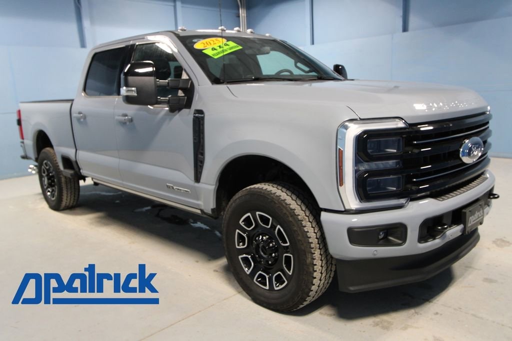 2025 Ford F-350SD Platinum We want you to shop confidently for your next used car at The BIG Ford Store, D-Patrick Ford. We are located on Highway 41 and Walnut in Evansville, right next to the Lloyd Expressway. Buy this used vehicle 100% online or in-store. This pre-owned vehicle was put through an extensive inspection before hitting our lot. Because of this, we are able to offer a 3-month/3,000-mile comprehensive limited warranty. You also get our Love It or Return It 5-day, 300-mile Exchange Policy. See our website for more details on both. We also offer extended service plans, vehicle protection plans, and offer a CarFax vehicle history report. *Prices listed do not include a $250 documentation fee, applicable tax, title, tags, license, or $195 service and preparation. All pricing, vehicle information, and features (such as accessories and color) are believed to be accurate, but we do not warrant or guarantee such accuracy. The prices shown above may vary from region to region, and incentives are subject to change. Some offers listed may not be available to all customers. All online sale commitments are subject to confirmation of continued availability of vehicle. Once availability is confirmed, online sale agreement becomes binding upon the parties. If any information found on the website is thought to be erroneous, please verify information with a customer service representative. See dealer for full details. Looking to sell your current vehicle? We buy cars for cash. Every test drive at D-Patrick Ford in Evansville earns $10 to a local charity. Schedule your test drive today! 4WD, 4-Wheel Disc Brakes, 410 Amp Dual Alternators, 5th Wheel/Gooseneck Hitch Prep Package, ABS brakes, Adjustable pedals, Air Conditioning, All-Weather Floor Mats, Alloy wheels, AM/FM radio: SiriusXM with 360L, Auto High-beam Headlights, Auto-dimming Rear-View mirror, Automatic temperature control, Brake assist, Compass, Delay-off headlights, Driver door bin, Driver vanity mirror, Dual front impact airbags, Dual front side impact airbags, Electronic Stability Control, Electronic-Locking with 3.55 Axle Ratio, Emergency communication system: SYNC 4 911 Assist, Engine Block Heater, Flow-Through Console, Front and Rear Wheel Well Liners, Front anti-roll bar, Front Bucket Seats, Front Center Armrest, Front dual zone A/C, Front fog lights, Front License Plate Bracket, Front reading lights, Fully automatic headlights, FX4 Off-Road Package, Garage door transmitter, Heated door mirrors, Heated front seats, Heated rear seats, Heated steering wheel, Hill Descent Control, Illuminated entry, Internet access capable: FordPass Connect 5G, LED Roof Clearance Lights, Low tire pressure warning, Memory seat, Navigation System, Off-Road Specifically Tuned Shock Absorbers, Outside temperature display, Overhead airbag, Overhead console, Panic alarm, Passenger door bin, Passenger vanity mirror, Pedal memory, Power door mirrors, Power driver seat, Power passenger seat, Power steering, Power windows, Rain sensing wipers, Rear reading lights, Rear seat center armrest, Rear step bumper, Rear window defroster, Remote keyless entry, Security system, SiriusXM Radio with 360L, Snow Plow Prep Package, Speed control, Split folding rear seat, Steering wheel mounted audio controls, SYNC 4 with Enhanced Voice Recognition, Tachometer, Telescoping steering wheel, Tilt steering wheel, Traction control, Trip computer, Turn signal indicator mirrors, Twin Panel Power Moonroof, Unique FX4 Off-Road Box Decal, Upfitter Switches (6), Variably intermittent wipers, Ventilated front seats, 4WD. CARFAX One-Owner. 4D Crew Cab Platinum 10-Speed Automatic Power Stroke 6.7L V8 DI 32V OHV Turbodiesel 4WD Gray Metallic CALL TODAY (812) 625-4823 OR SHOP ONLINE AT WWW.DPATRICKFORD.COM.
