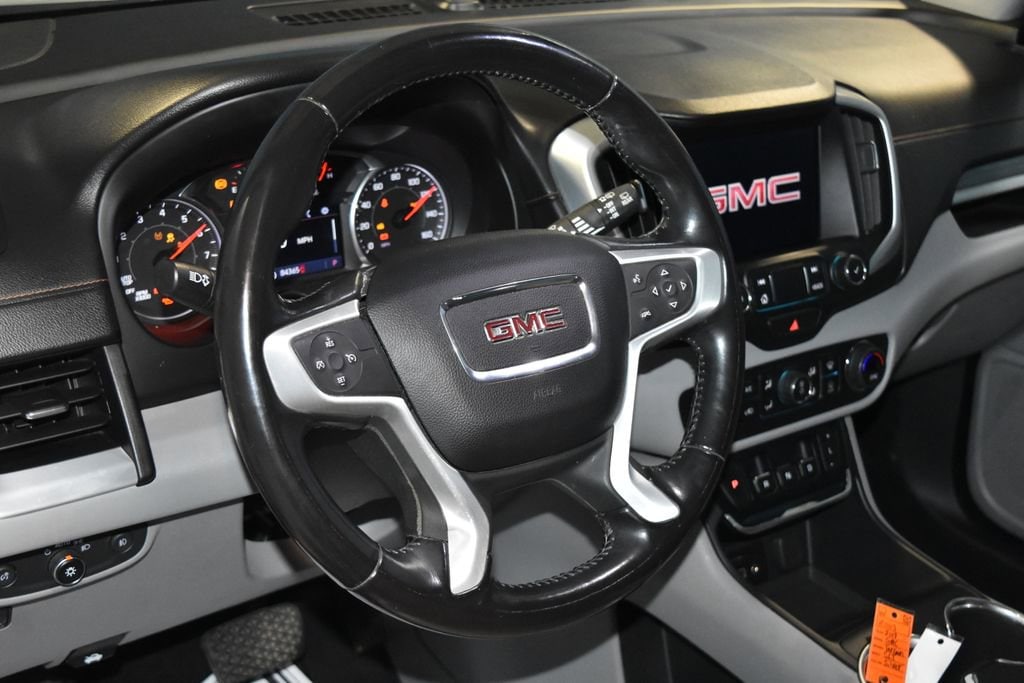 • AUDIO SYSTEM 8 DIAGONAL GMC INFOTAINMENT SYSTEM includes multi-touch display AM/FM/SiriusXM stereo Bluetooth streaming audio for music and most phones Android Auto and Apple CarPlay capability for compatible phones advanced voice recognition in-vehicle apps personalized profiles for infotainment and vehicle settings (STD),SLT PREFERRED EQUIPMENT GROUP Includes Standard Equipment,TRANSMISSION 9-SPEED AUTOMATIC 9T50 ELECTRONICALLY-CONTROLLED WITH OVERDRIVE,TIRES P235/50R19 ALL-SEASON BLACKWALL,EXHAUST DUAL WITH BRIGHT TIPS,WHEELS 19 X 7.5 (48.3 CM X 19.1 CM) MACHINED ALUMINUM with Gray painted accents,MEDIUM ASH GRAY/JET BLACK PERFORATED LEATHER-APPOINTED SEAT TRIM,AXLE 3.17 FINAL DRIVE RATIO,SEATS FRONT BUCKET (STD),BRAKES 4-WHEEL ANTILOCK 4-WHEEL DISC 12.6 FRONT AND 11.3 REAR,QUICKSILVER METALLIC,TIRE SPARE T125/70R17 BLACKWALL,WHEEL SPARE 17 (43.2 CM) STEEL,ENGINE 2.0L TURBO 4-CYLINDER SIDI VVT (252 hp [188.0 kW] @ 5500 rpm 260 lb-ft of torque [353.0 N-m] @ 2500 - 4500 rpm),Turbocharged,Front Wheel Drive,ABS,4-Wheel Disc Brakes,Aluminum Wheels,Tires - Front All-Season,Tires - Rear All-Season,Temporary Spare Tire,Luggage Rack,HID headlights,Automatic Headlights,Automatic Headlights,Fog Lamps,Privacy Glass,Heated Mirrors,Power Mirror(s),Integrated Turn Signal Mirrors,AM/FM Stereo,Satellite Radio,MP3 Capability,Bluetooth Connection,Smart Device Integration,Requires Subscription,Satellite Radio,Requires Subscription,MP3 Capability,Auxiliary Audio Input,Bluetooth Connection,WiFi Hotspot,Bucket Seats,Leather Seats,Heated Front Seat(s),Power Driver Seat,Driver Adjustable Lumbar,Driver Adjustable Lumbar,Pass-Through Rear Seat,Rear Bench Seat,Floor Mats,Floor Mats,Leather Steering Wheel,Steering Wheel Audio Controls,Tire Pressure Monitor,Trip Computer,Power Windows,Power Windows,Power Windows,Power Door Locks,Keyless Entry,Power Door Locks,Security System,Keyless Start,Remote Engine Start,Cruise Control,Security System,Climate Control,Multi-Zone A/C,A/C,Power Outlet,Auto-Dimming Rearview Mirror,Traction Control,Stability Control,Daytime Running Lights,Driver Air Bag,Passenger Air Bag,Front Side Air Bag,Front Head Air Bag,Rear Head Air Bag,Passenger Air Bag Sensor,Back-Up Camera,Telematics,Requires Subscription,Driver Restriction Features,Tire Pressure Monitor